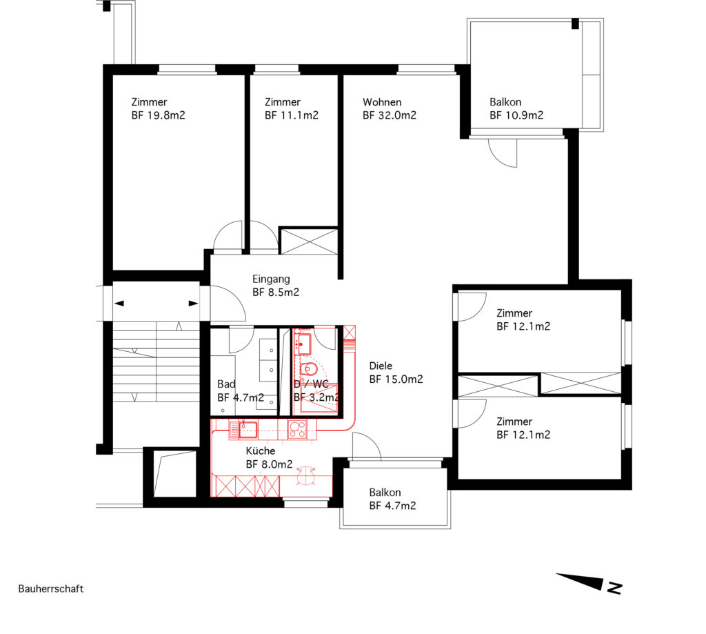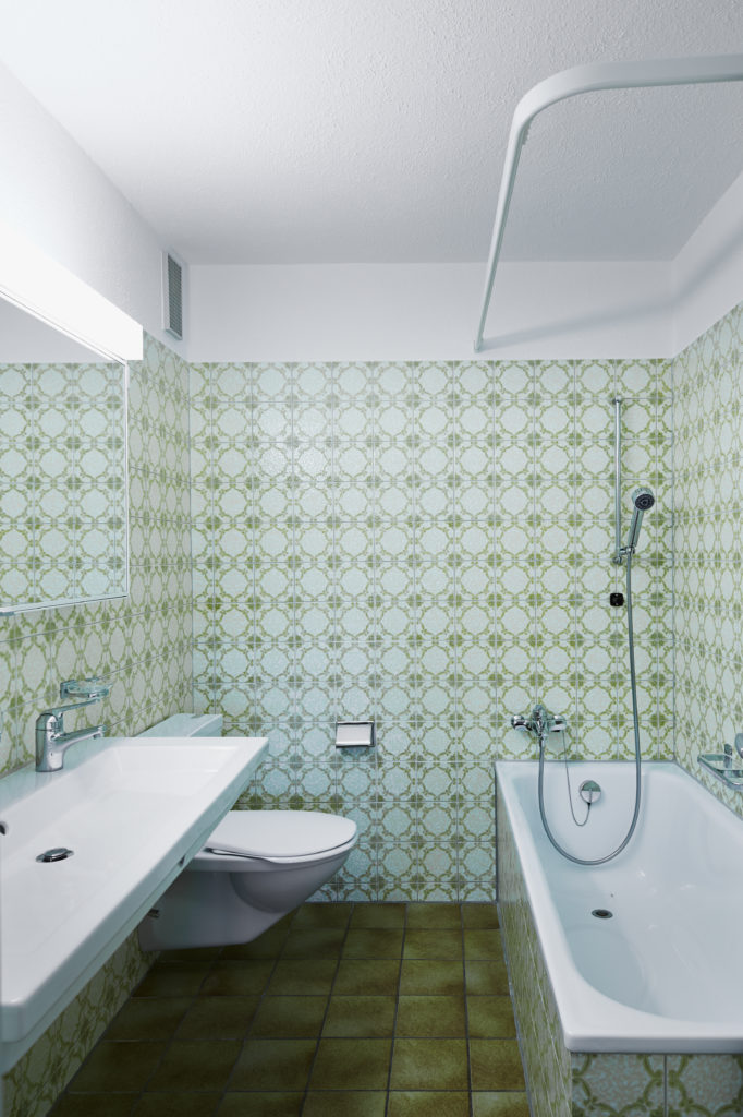 Die sanierte 5-Zimmerwohnung ist Teil der 70er Jahre-Wohnüberbauung In der Breiti, nahe des Albisriederdörfli in Zürich. Die Wohnung war vor dem Umbau mit einer zeittypischen, geschlossenen Küche und fensterlosen Badezimmern in Braun-Grüntönen ausgestattet. Im Vergleich zum offenen und grosszügigen Grundriss der Wohnung, welcher den heutigen Ansprüchen an das Wohnen immer noch entspricht, wirkten die Küche und die zwei Badezimmer aus heutiger Sicht eng und klein. Im Zuge der Wohnungssanierung wurde deshalb die Wand zwischen dem Essbereich und der Küche geöffnet. So entstand räumlich ein fliessender Übergang von Esszimmer zur Küche, dessen Pendent sich im bestehenden Grundriss bereits als offener Raumübergang vom Wohnraum zum grossen Eingangsbereich finden liess. Durch die Weiterführung des Küchenmöbels in den Essbereich wurden die Küche und der Essbereich zusätzlich miteinander verbunden, ohne jedoch dem Essbereich die Atmosphäre einer Küche zu geben. Obwohl die räumliche Struktur und die bestehenden Grössen von Küche und Badezimmer mit dem Umbau nicht geändert werden konnten, entstand durch den Eingriff und durch die Form und Farbgebung der neuen Einbauten ein grosszügiges, zum offenen Grundriss passendes Ambiente.